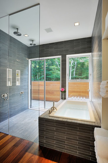 double insulated for efficiency and are a perfect scale for hanging large art. By staggering the walls slightly, tall, narrow windows admit indirect light and allow glimpses of the landscape.