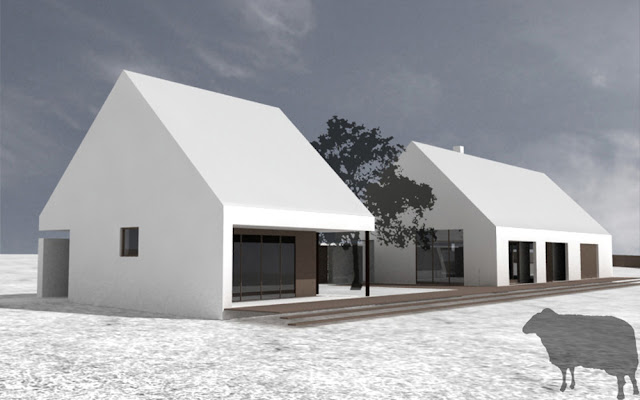 The new building replaces an old storage facility. Its structure follows the gable and pitched roof pattern but it uses untraditional materials and detailing. The agriculture-inspired details, the wood-covered sliding door, the metal sheet are to counterbalance the typical conservative-romantic local style. The owner intends to create a self-sustaining small farm in a few years.The Baron House in Sweden, designed by John Pawson, serves as a model for the family house.