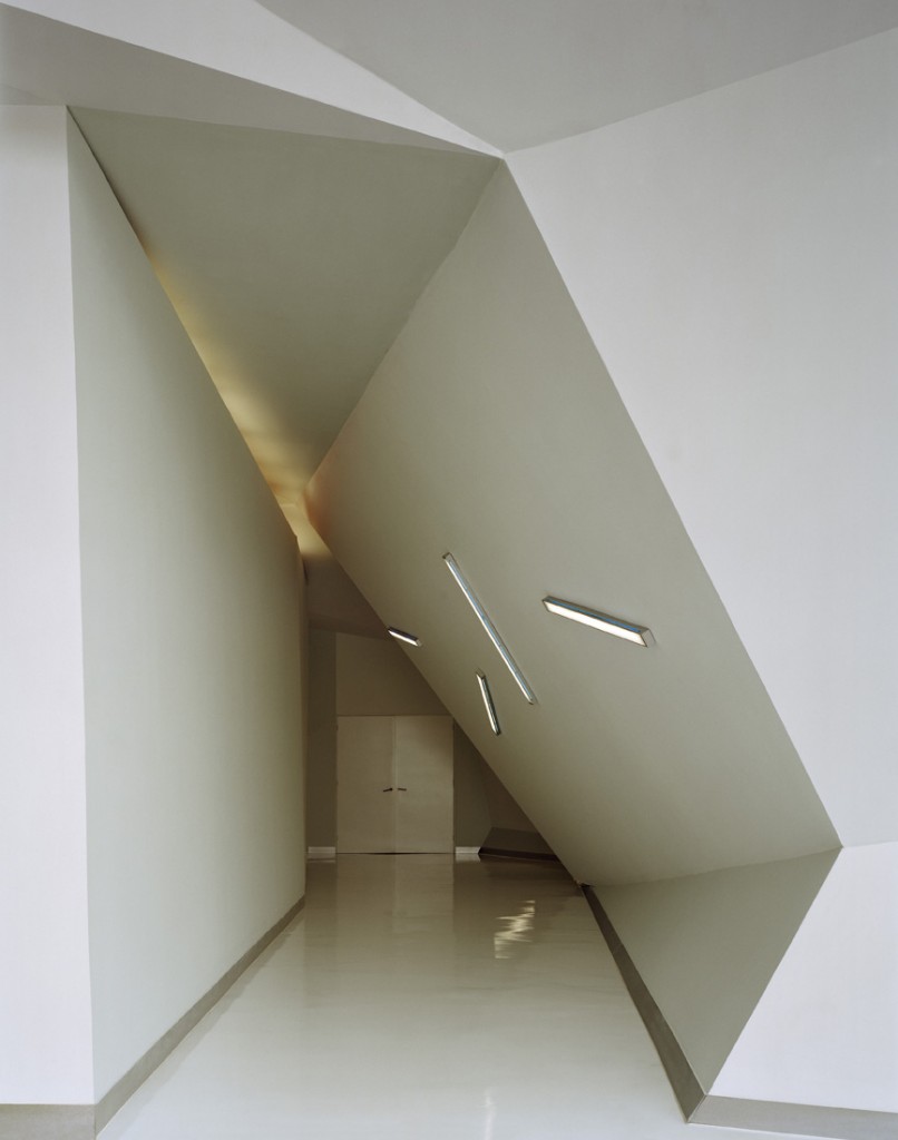 While we where covering the exterior with hunter Douglas color deck 408 corrugated panels that change directions according to the folding planes and to drain the rain water, on the interior we where using acoustical and thermical insulation panels covered with a plaster panels finished in slight variations of white and grey tones to accentuate the folding planes a bit more.